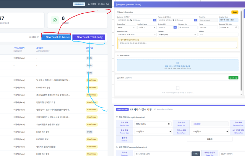우측 뉴 티켓 (Third-party) 선택하면 새로운 티켓 입력 창 중 자체수리 접수창이 나옵니다.